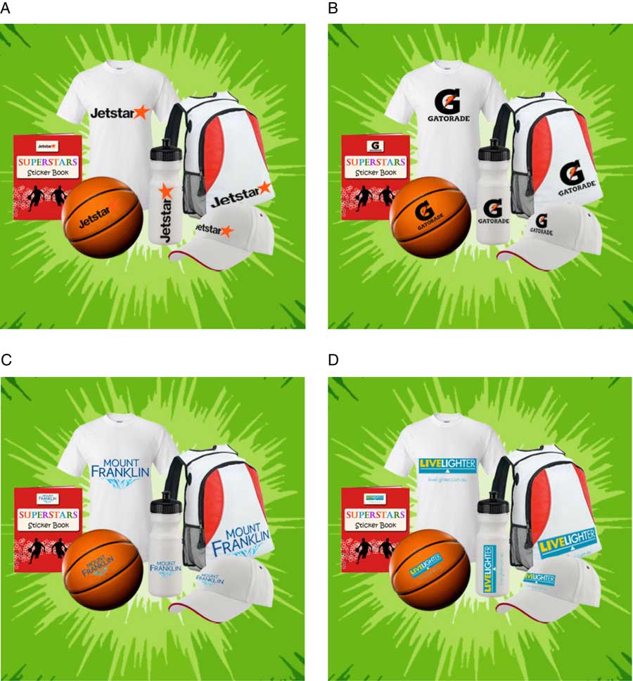 Participants assigned the breakfast cereal product category were given the choice of Nutri-Grain (unhealthy sponsor brand), Milo cereal (unhealthy non-sponsor brand), Weet-Bix (healthier sponsor brand) and Cheerios (healthier non-sponsor brand). Participants assigned to the takeaway food category were given the choice of McDonald’s (unhealthy sponsor brand), KFC (unhealthy non-sponsor brand), Sushi Sushi (healthier sponsor brand) or Subway (healthier non-sponsor brand). Participants assigned to the non-alcoholic beverage product category were given the choice of Gatorade (unhealthy sponsor brand), Powerade (unhealthy non-sponsor brand), Mount Franklin (healthier sponsor brand) and Cool Ridge spring water (healthier non-sponsor brand). All the products featured as sponsor and non-sponsor brands within a given product category (e.g. cereal, takeaway food, non-alcoholic beverage) were chosen because they are prominent brands in the Australian marketplace. The brands featured as sponsors have previously used sport sponsorship to market their products in Australia. The non-sponsor brands represented a similar brand to their corresponding sponsor brand in terms of product type, healthfulness and brand prominence (e.g. Gatorade v. Powerade).