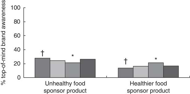 Fig. 2 Proportion with top-of-mind brand awareness for unhealthy food sponsor products and healthier food sponsor products by sponsorship condition (