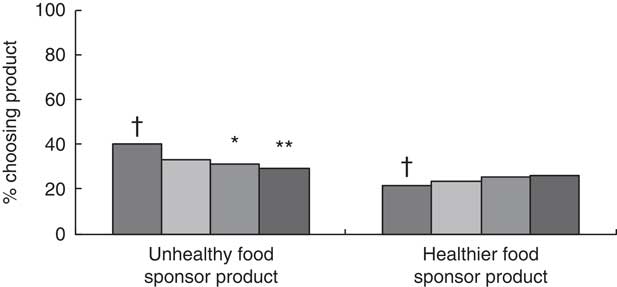 Fig. 3 Proportion choosing unhealthy food sponsor products and healthier food sponsor products, respectively, by sponsorship condition (