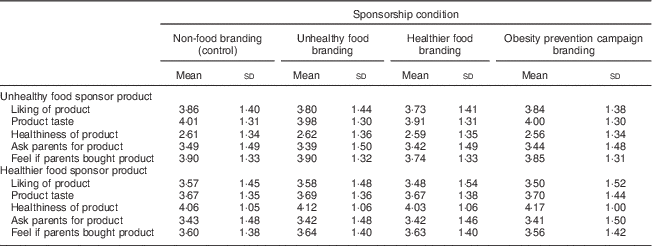 Among the non-food branding sub-sample (control condition), the healthier food sponsor product was rated as significantly more healthy than the unhealthy food sponsor product (mean 4·06 v. 2·61; t (288)=15·15, P<0·001), suggesting that children’s perception of the healthiness of the products aligned with the products’ actual nutritional profiles.
