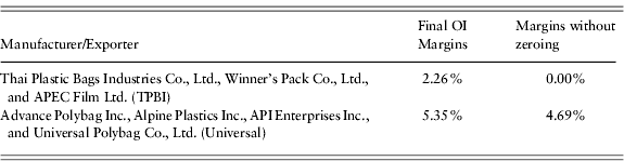 Thus, the largest Thai exporters (TPBI) had their margins changed to zero and, given that the recalculation technically involved original investigation margins, the dumping order was revoked for TPBI. This case therefore supports our conjecture that cases where the removal of zeroing results in de minimis margins are the most likely to be challenged at the WTO.