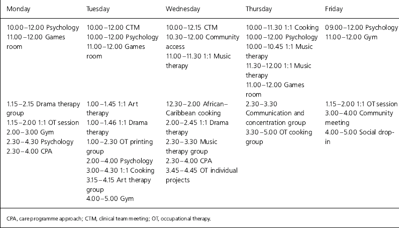 | 1.15-2.15 Drama therapy group | 1.00-1.45 1:1 Art therapy | 12.30-2.00 African—Caribbean cooking | 2.30-3.30 Communication and concentration group | 1.15-2.00 1:1 OT session |