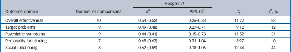 heterogeneity (Table 1). Reference Huedo-Medina, Sanchez-Meca, Botella and Marin-Martinez36 For Q, all tests of significance yielded insignificant results (P≥0.09). The I Reference Gabbard2 index for overall outcome, target problems, symptoms, personality functioning and social functioning indicated low to moderate heterogeneity (Table 1). Reference Huedo-Medina, Sanchez-Meca, Botella and Marin-Martinez36 For follow-up, the number of studies providing data was too limited to calculate reasonable Q and I Reference Gabbard2 statistics.