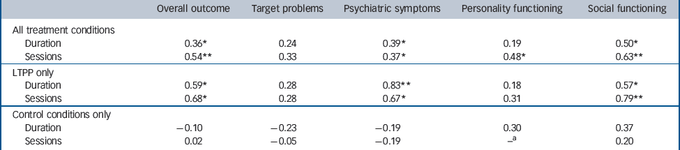 Including all treatment conditions (LTPP and non-LTPP), all outcome variables except for target problems showed significant Spearman correlations with the number of sessions (Table 2). Treatment duration was significantly correlated with improvements