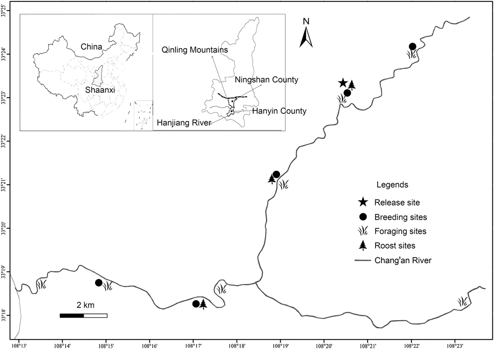 Figure 1. Map of released region showing the location of the release site (pentagram), breeding sites (solid circle), foraging sites (grass) and roost sites (tree) for the reintroduced population. An adult male of the reintroduced population travelled south-east (to Hanyin County) and paired with another female from the wild population of Yangxian County.