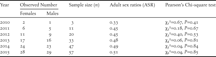 Table 1. Adult sex ratio (ASR) estimates from wild-born individuals of the focal Crested Ibis population.