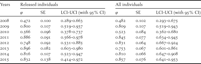 Table 3. Annual survival estimates (φ), SE, 95% confidence intervals and relative important values for the best model of the released and all individuals.