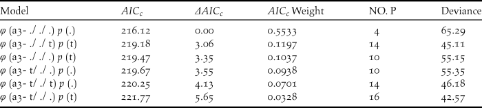 Six relatively good models describing survival rate (φ) and resighting probability (p) were selected. The number of estimated parameters is given by (NO. P).