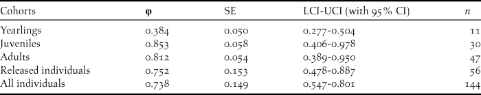 Table 5. Survival estimates (φ), SE, 95% confidence intervals and relative important values for the best model of the different age classes, and mean survival probabilities for released and all individuals.
