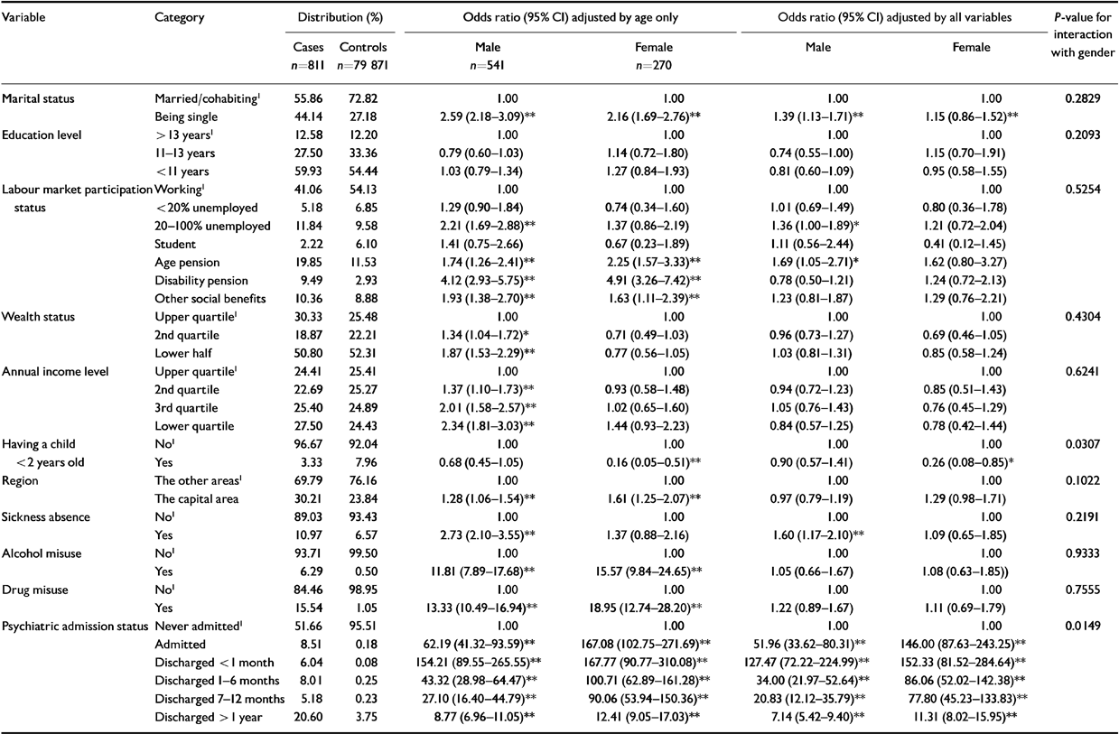 The main results of this study are shown in Table 1. The 3rd and 4th columns display the percentage distributions of cases and controls in different variable categories. The female:male ratios were 270:541 among suicides and 39 981:39 890 among controls in our study population.