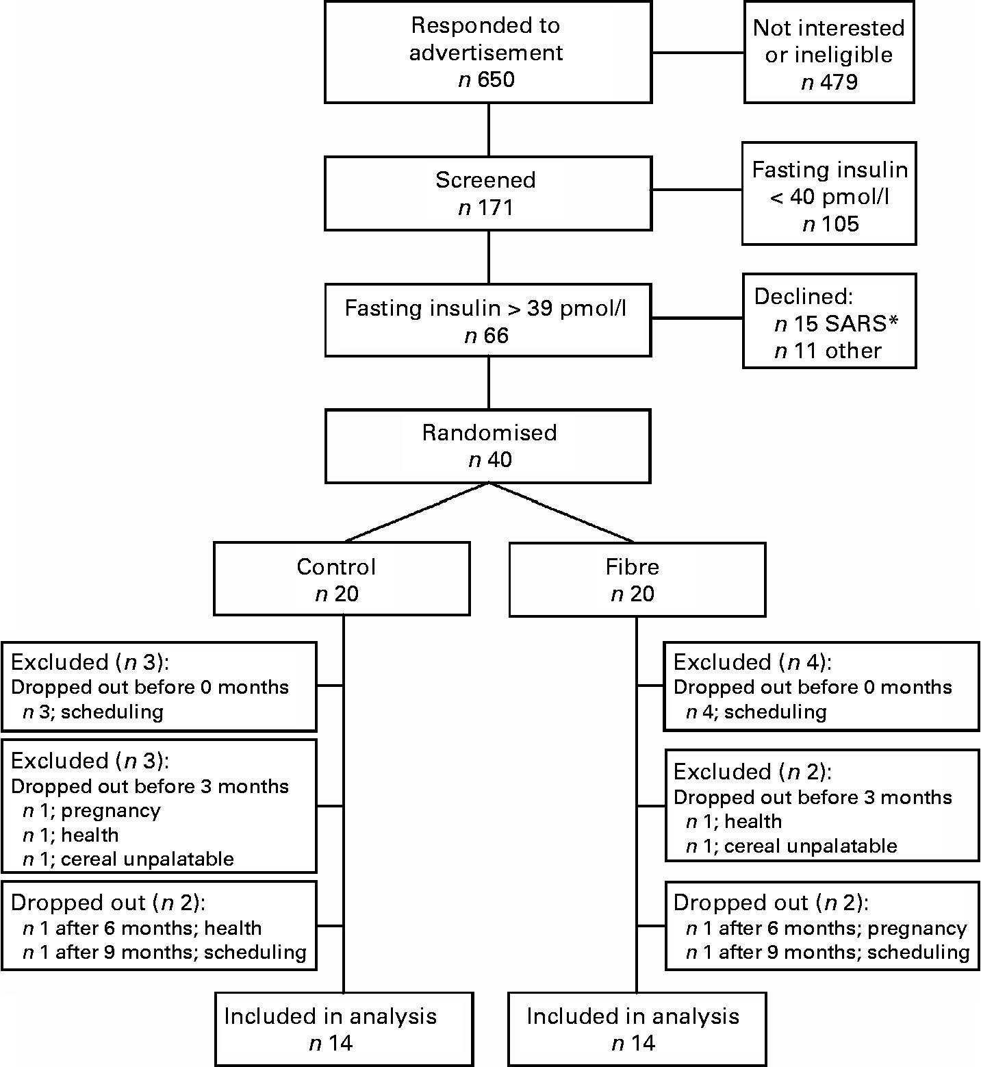 Fig. 1 Study flow chart. * The 2003 epidemic of severe acute respiratory syndrome (SARS) in Toronto resulted in a temporary halt of all clinical research. After the epidemic was over, fifteen previously recruited subjects declined to participate.