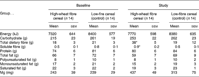* Mean value was significantly different from that at baseline for the high-fibre group and from the study value for the control group (P < 0·05). No other differences were statistically significant.