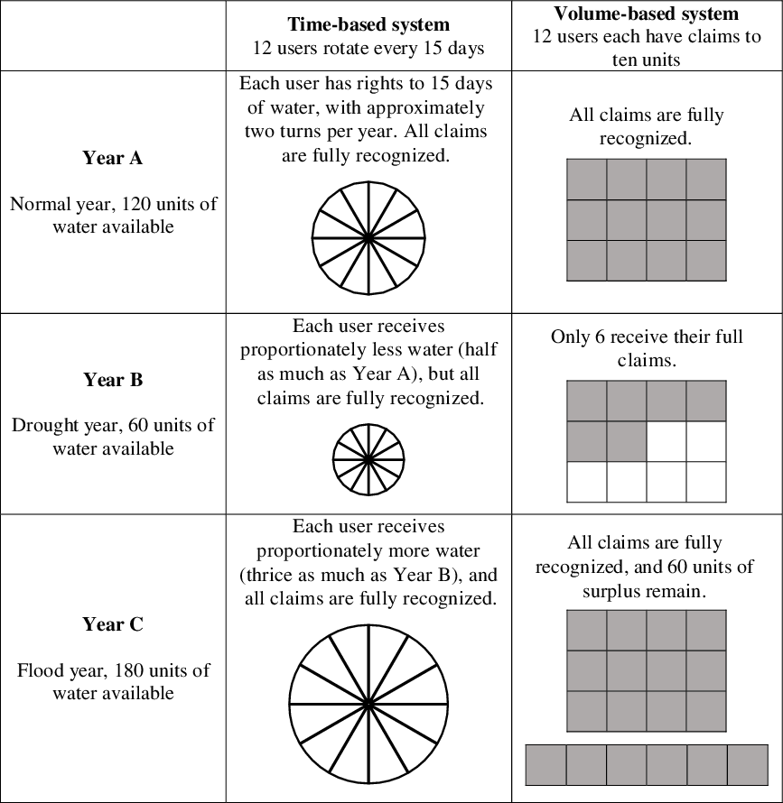 Figure 1. A visualization of the differences between idealized versions of time and volume-based water rights. Credit: Courtesy of the author.
