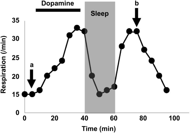 Figure 1: The respiratory alternation during the dopa challenge test. While intravenous dopamine administration induced hyperventilation, sleeping attenuated it. The arterial pH, CO2, O2, and HCO3 were 7.444, 38.6 mmHg, 90.5 mmHg, and 25.9 mmol/L at a and 7.485, 33.1 mmHg, 106.1 mmHg, and 24.4 mmol/L at b, respectively.