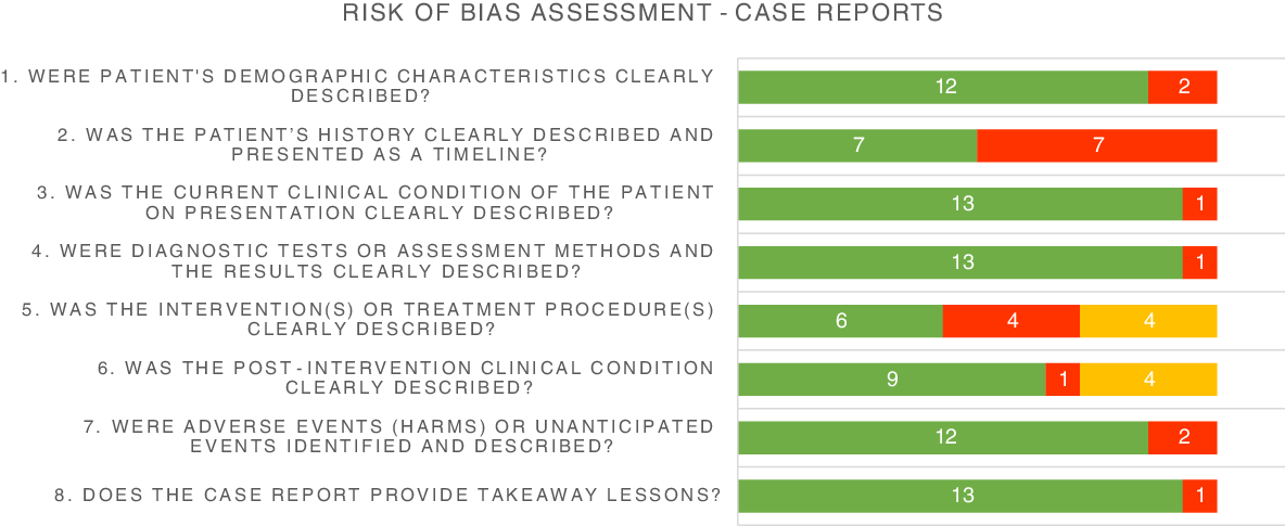 The risk of bias assessment of case reports is shown in Fig. 2. For most domains, case reports were assessed as low risk of bias. However, in half of the studies a patient’s medical history was not or poorly described. In addition, in almost half of the studies which reported a treatment, the treatment was not clearly described in terms of dosage or frequency and therefore was rated as having a high risk of bias. The cohort study was rated to be of fair quality, as shown in Table 1.