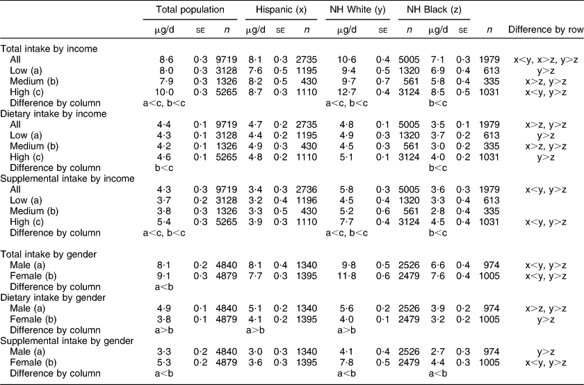 When vitamin D intake (total, dietary and supplemental) was compared for all participants in race/ethnic groups, NH Whites had a significantly higher intake of vitamin D than NH Blacks and Hispanics (Table 2). Vitamin D intake (total, dietary and supplemental) by Hispanics was also higher than in NH Blacks.