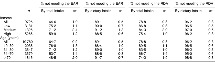 A high percentage (78·8 %) of adults did not meet the RDA for vitamin D (Table 3). When examined by income, the percentage not meeting the RDA for vitamin D by total intake (diet and supplements) was less in the high (75·4 %) v. the medium (84·3 %) or the low (86·8 %) income categories. Moreover, the percentage not meeting the RDA by total intake (diet plus supplements) was less for adults aged 51–70 years (66·7 %) and >70 years (74·2 %). Again, use of supplements largely explained the decreasing percentage of participants not meeting the RDA with ageing.