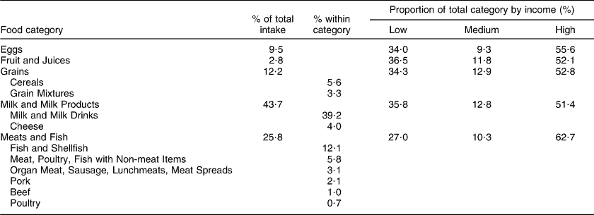 The intake of vitamin D from food sources was determined for the major food categories used by the Food and Nutrient Database for Dietary Studies( 33 ). In addition, the proportion of intake of the major food categories was assessed by income. Within the major food groups, vitamin D intake was estimated by food sub-categories.