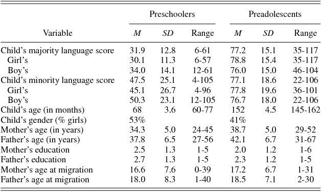 A total of 202 families (97 preschoolers, 105 preadolescents) participated at the Norwegian site. The present study included 174 families (81 preschoolers, 53% girls; 92 preadolescents, 41% girls) from this sample. We excluded (a) children who migrated to Norway at/after the age of 3 (n = 7); (b) children who reported that they spoke a language other than Turkish or Norwegian at home (n = 5); (c) children with physical impairments (n = 2); (d) children missing data on two or more predictor variables (n = 9); and (e) children missing data on one or both criterion variables (n = 6). Given the research showing that crucial language learning takes place before the age of 3 to 4 (Torkildsen von Koss, Reference Torkildsen von Koss, Moe, Slinning and Hansen2010), we excluded children who migrated to Norway after/at the age of 3 to ensure a uniform sample with regard to the children's early language learning context and their immigrant generation.