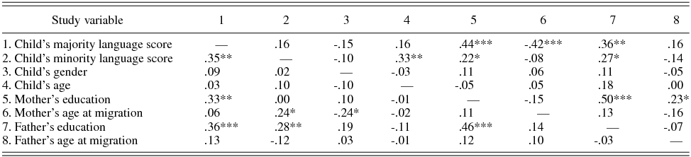 Results from bivariate correlation analyses are presented in Table 2. It can be seen that both mother's and father's education level correlated positively with the minority and majority language vocabulary scores of both preschoolers and preadolescents. However, there was one notable exception: the correlation between mother's education and the preadolescents’ minority vocabulary score was not significant. With respect to age at migration, the findings showed that mother's age at migration correlated significantly and negatively with the preschoolers’, but not with the preadolescents’ majority vocabulary scores. This implies that the older the mothers were at the time of migration, the lower the preschoolers’ majority vocabulary scores. In addition, mother's age at migration was positively associated with the preadolescents’ minority vocabulary scores, whereas among the preschoolers, the correlation was low and nonsignificant. There was a strong positive correlation between mothers’ and fathers’ education in both age groups, suggesting that spouses tended to have a similar level of educational attainment. In contrast, the association between mothers’ and fathers’ age at migration was nonsignificant.