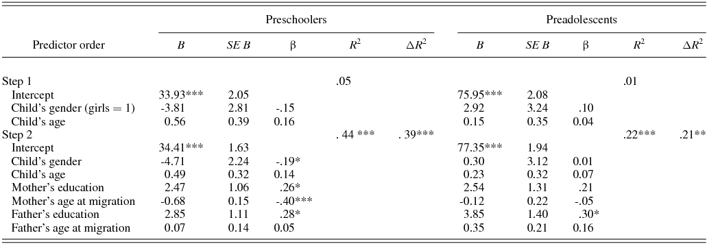 Descriptive statistics are presented in Table 1. The preschool and the preadolescent groups were similar with respect to parental age at migration. The preschoolers’ mothers, but not fathers, reported higher educational level (M = 2.5, SD = 1.3) than the preadolescents’ mothers (M = 2.0, SD = 1.2), t (171) = 2.28, p = .014. The fathers were slightly higher educated (M = 2.4, SD = 1.2) than the mothers in the preadolescent group (M = 2.0, SD = 1.3), t (92) = –2.77, p = .007.
