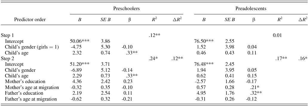 Among the preschoolers, mothers’ age at migration and mothers’ and fathers’ level of education significantly predicted majority language vocabulary scores, when the child's age and gender were controlled for. The total variance explained by the model was 44%, F (6, 74) = 9.59, p < .001 (Table 3). Among the preadolescents, fathers’ education was the only significant predictor and the total model accounted for 22% of the variance, F (6, 85) = 3.89, p = .002 (Table 3).