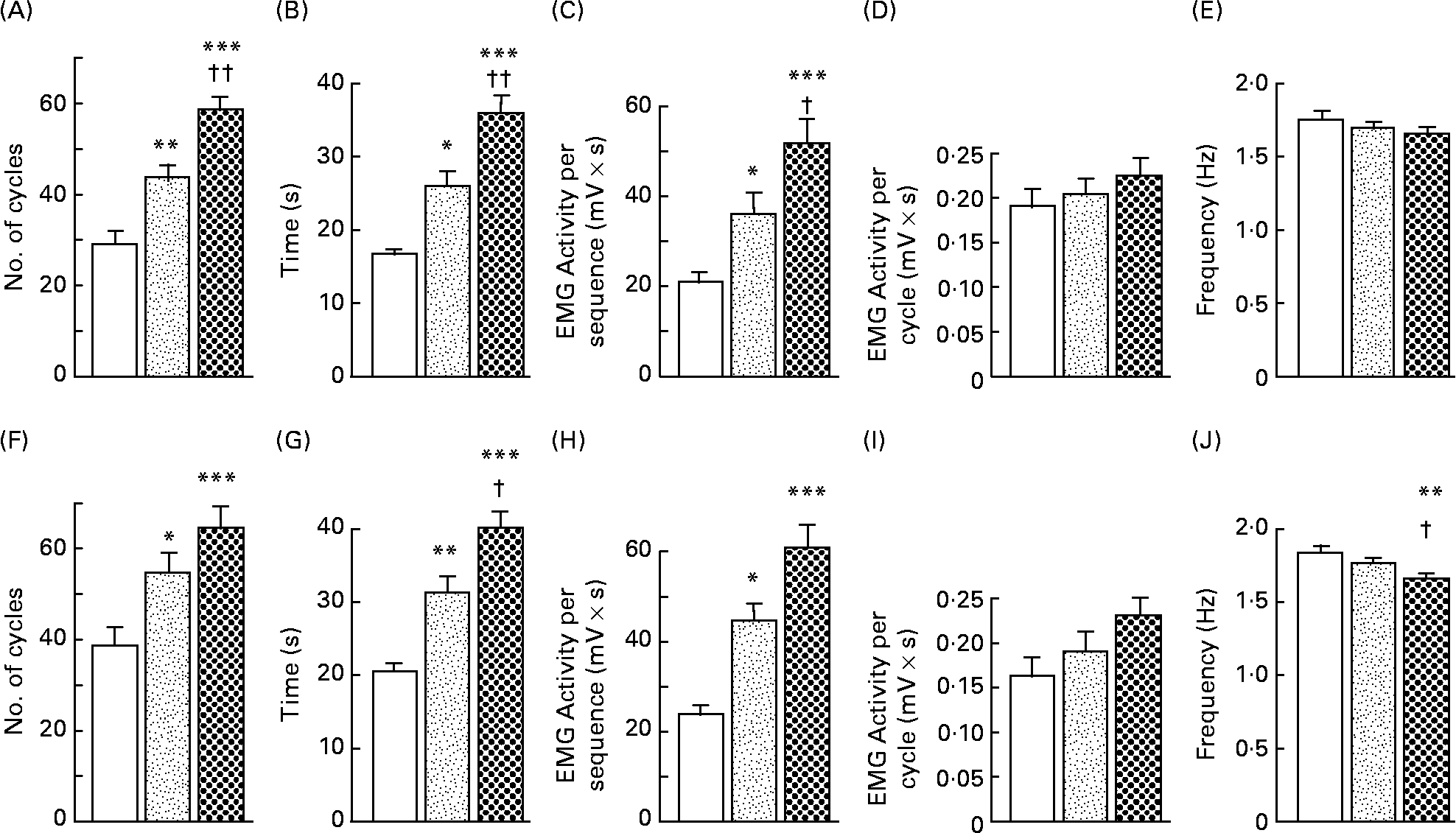 )). Number of cycles (A, F), duration of sequence of mastication (B, G), mean EMG activity per sequence (C, H) and per cycle (D, I) and cycle frequency (E, J) were measured from EMG recordings. Two test foods were studied, groundnut (A–E) and carrot (F–J). Values are means, with their standard errors represented by vertical bars. Mean value was significantly different from that of young dentate subjects: *P < 0·05, **P < 0·01, ***P < 0·001. Mean value was significantly different from that of aged dentate subjects: †P < 0·05, ††P < 0·01.