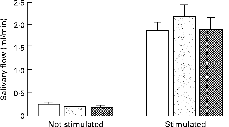 )). Values are mean flow rates for fourteen subjects per group, with their standard errors represented by vertical bars. A significant effect (P < 0·001) was found only between the two modes of salivation.