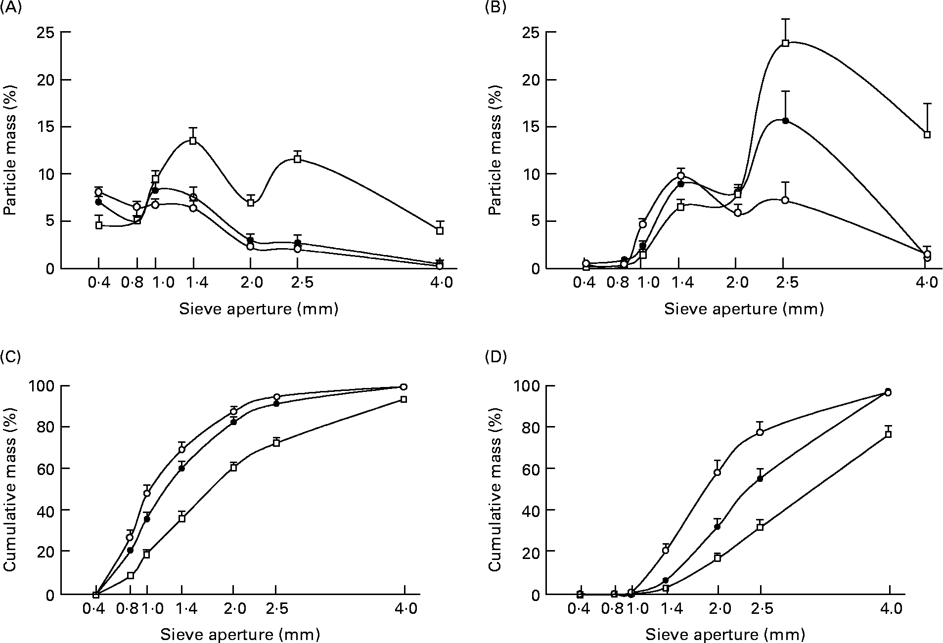 Fig. 3 Distribution of groundnut (A, C) and carrot (B, D) particles in three groups of fourteen subjects (young dentate subjects (●), aged dentate subjects (○) and aged denture wearers (□)). (A and B) Distribution of the mean mass through the seven sieves. Values are mean percentages of the initial mass for each of the sieves, with their standard errors represented by vertical bars. The measurements were made on expectorated boluses obtained after a complete chewing sequence and just before swallowing. (C and D) Cumulative percentages of mean mass recovered from each of the seven diameter classes of particles. Values are calculated as percentages of the bolus masses collected before swallowing, with their standard errors represented by vertical bars.