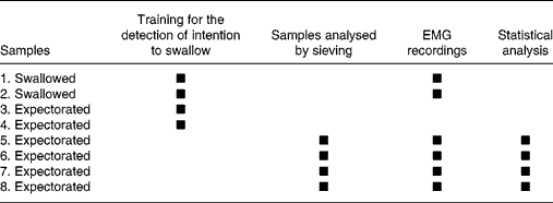 Each subject attended two sessions lasting 1 h each. During the sessions, the subjects were instructed to chew in a usual manner. Subjects had been asked to have a meal between 1 and 2 h before the experimentation to reduce possible variations due to desire to swallow. The first session was designed to familiarise the subjects with the experimental context. EMG activity recording, food bolus sampling for granulometric analysis and salivary flow collection were carried out during the second session. The session consisted of eight masticatory sequences during which eight samples of the same test food were chewed (Table 1). For all the subjects, food samples 1 and 2 were chewed and swallowed, and the masticatory sequences were recorded by electromyography. Samples 3 and 4 were used to train subjects to detect swallowing threshold and to expectorate just before swallowing. Samples 5–8 of the second session were used for granulometry and EMG recording analyses. Since it is known that there is no effect of repetition, the EMG and granulometric values from sequences 5–8 were averagedReference Peyron, Mishellany and Woda8, Reference Peyron, Lassauzay and Woda12, Reference Mishellany, Woda, Labas and Peyron18. During each session, the eight masticatory sequences were performed for groundnuts and then for carrots.