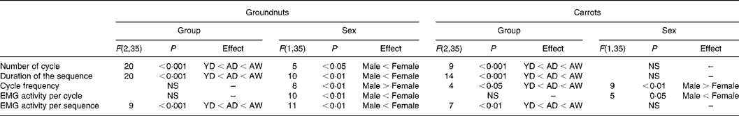 Comparison between young and aged dentate subjects showed a strong increase in the aged group in the number of cycles, sequence duration and EMG activity per sequence (Fig. 1 and Table 2). No significant difference was found for either EMG activity per cycle or cycle frequency. A further increase in number of cycles, sequence duration and EMG activity per sequence was observed in the aged denture wearers when this group was compared with the aged dentate subjects (Fig. 1 and Table 2). These increases were observed for both test foods. No significant difference in the EMG activity per cycle between the two aged groups was found and a significant difference in cycle frequency was observed comparing the aged dentate subjects with denture wearers only for carrots. The effect of sex found for sequence duration, cycle frequency and EMG activity per cycle and sequence is shown in Table 2.