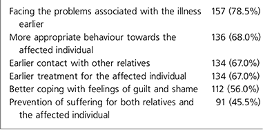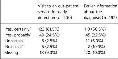 Table 1 shows whether the relatives would have visited the out-patient service for early detection if they had had the opportunity: 123 (61.5%) would have done so ‘certainly’ and another 49 (24.5%) ‘probably’. Of the relatives of psychotic patients who answered the question of whether they would have preferred to be informed earlier about the diagnosis of psychosis, 113 (56.5%) replied ‘yes, certainly’ and 45 (22.5%) replied ‘yes, probably’.