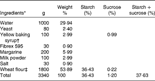 Arabinose content in the buns and muffins was determined using two different methods. Arabinose content in the buns was determined by direct hydrolysis – homogenisation with 12 m-H2SO4 followed by hydrolysis with 2 m-H2SO4 ( Reference Knudsen 14 ). Arabinose content in the muffins was determined by direct hydrolysis after removal of lipids by extraction with diethyl ether. Arabinose in the extracts or hydrolysates was reduced with potassium borohydride to the corresponding sugar alcohol, which was acetylated with acetic anhydride using n-methyl imidazole as a catalyst( Reference Connors and Pandit 15 ) before gas chromatographic analysis. The DM content in the dough, buns and muffins was determined by freeze-drying. The recovery of l-arabinose that was added was estimated to be 89 (sem 7·6) % for the buns and 73 (sem 4·0) % for the muffins. l-arabinose recovery data are given in Table 3.