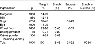 l-Arabinose was added on a weight % basis in relation to sucrose and starch contents and the concentrations – 5 and 10 % l-arabinose – were based on a previous study with l-arabinose (maximum 8 %) added to a sucrose drink( Reference Krog-Mikkelsen, Hels and Tetens 12 ).