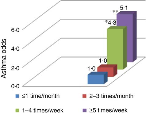 The present analyses showed that after adjusting for FD and ndSD, the odds of asthma among children aged 2–9 years reporting AJ consumption ≥1–4 times/week was nearly three times that of low or non-AJ consumers. Odds of asthma remained more than two times higher among ≥5 times/week AJ consumers v. low or non-AJ consumers. Further analysis indicated the odds of asthma among children aged 2–9 years reporting consumption of all EFF beverages (AJ, FD and ndDS) ≥5 times/week was more than five times that of low or non-EFF beverage consumers.