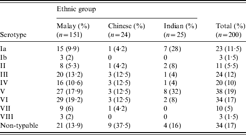 The ethnic distribution was Malays (75·5%), followed by Indians (12·5%) and Chinese (12%). The mean age of the women was 28·9 (±4·7) years. Of the 200 GBS isolates, serotypes V (19%) and VI (17%) were predominant followed by serotypes III, Ia and IV which were isolated at almost similar frequencies (12%, 11·5% and 10%, respectively). Serotypes II, VII and VIII constituted 12% of the isolates (Table 1) and 17% were NT. Serotypes V (17·9%) and VI (19·2%) isolates were the most prevalent types in Malay women whereas in Chinese women, 37·5% were serologically NT; serotypes V (32%) and Ia (28%) predominated in Indian women.