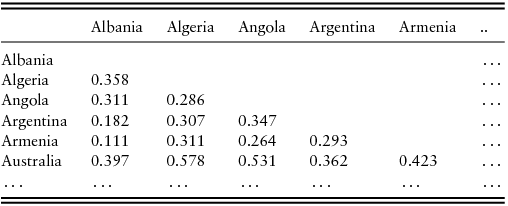 The resulting adjacency matrix shows the average difference between each country pair. For example, in Table 3 it can be seen that Albania is closer to Armenia (average difference of 0.111) than to Algeria, Angola, Argentina and Australia (average differences of 0.182, 0311, 0.358 and 0.397).