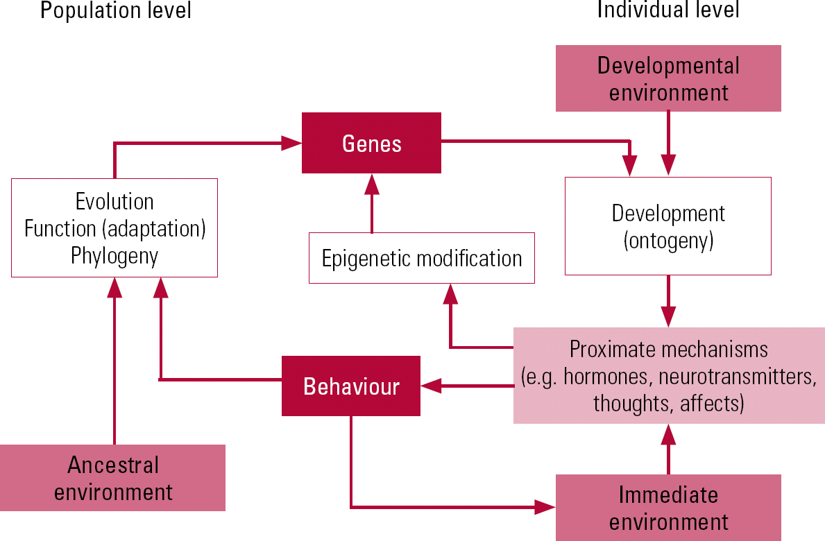 We will start by considering the proximate mechanisms, which are subdivided into: causation, which includes immediate psychological and physiological stimuli, meanings, learning and the neurochemical substrate; and development (ontogenesis) – how behaviour is influenced by early experience and how it changes with age (Fig. 1).