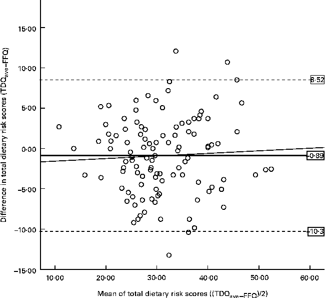 To assess reliability and relative validity at the individual level, intra-class correlations (ICC) and Pearson's correlations, defined as low ≤ 0·50, moderate 0·51–0·69, and high ≥ 0·70( Reference Pallant 42 ), were used. At the group level, paired t tests were used for both analyses. A Bland–Altman plot was constructed to assess the strength of agreement between the two tools by plotting the mean bias, i.e. difference between the TDQave and FFQ risk scores, against the mean of the tools. The plot was assessed visually and linear regression analysis performed to test for any systematic bias. Agreement at the individual level is defined as the limits of agreement ( ± 2 sd) of the mean bias and that at the group level by the mean bias and slope of the mean bias line( Reference Magarey, Golley and Spurrier 17 ).