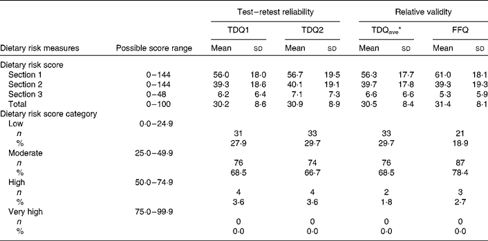 Risk scores were evaluated for test–retest reliability and relative validity of section and total scores. Reliability was assessed by comparing scores obtained during the first administration (TDQ1) and second administration (TDQ2) of the TDQ and relative validity by evaluating average scores (termed ‘TDQave’) derived from two administrations of the TDQ ((TDQ1+TDQ2)/2) against FFQ risk scores. Average risk scores were used in the validity analysis instead of the TDQ1 or TDQ2 scores as these cover a 2-week period of intake, more in line with the 4-week assessment period of the FFQ, and are thus a better representation of ‘usual’ intake and risk. As the majority of scores were normally distributed, parametric tests were used in all analyses for consistency.