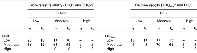 Classification analysis was conducted to determine whether the participants were classified into the same dietary risk category (low, moderate, high and very high) during each TDQ administration and by TDQave scores compared with the FFQ scores.