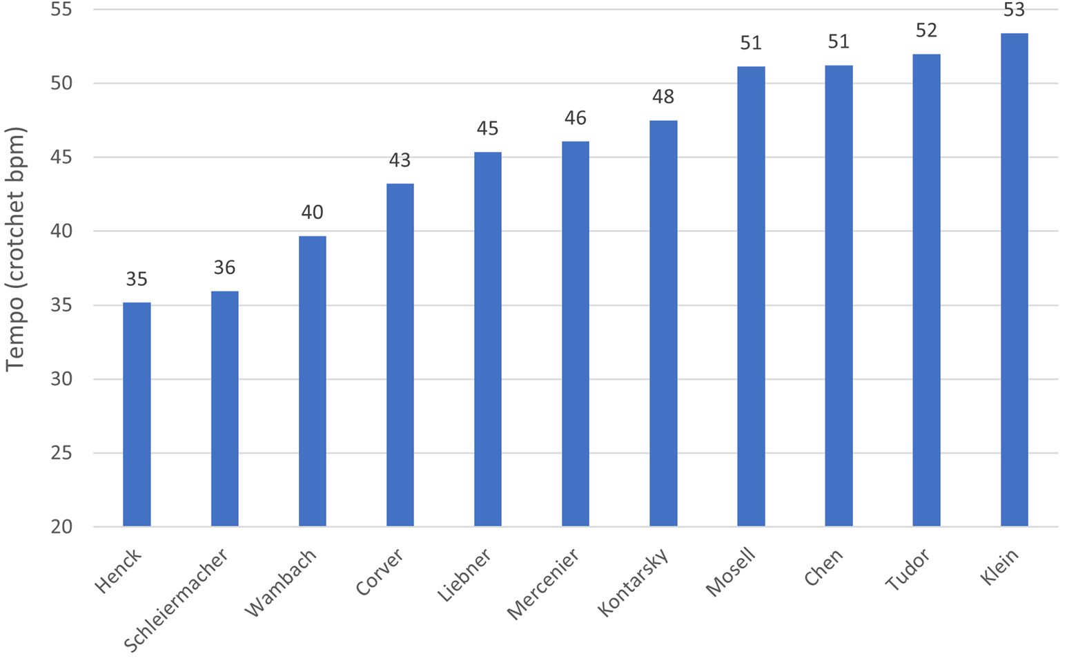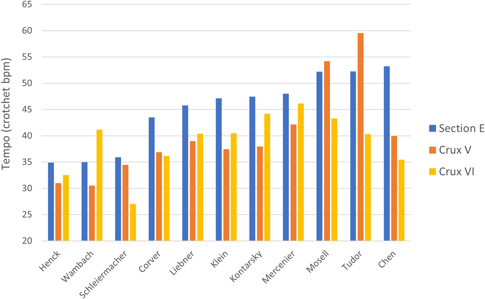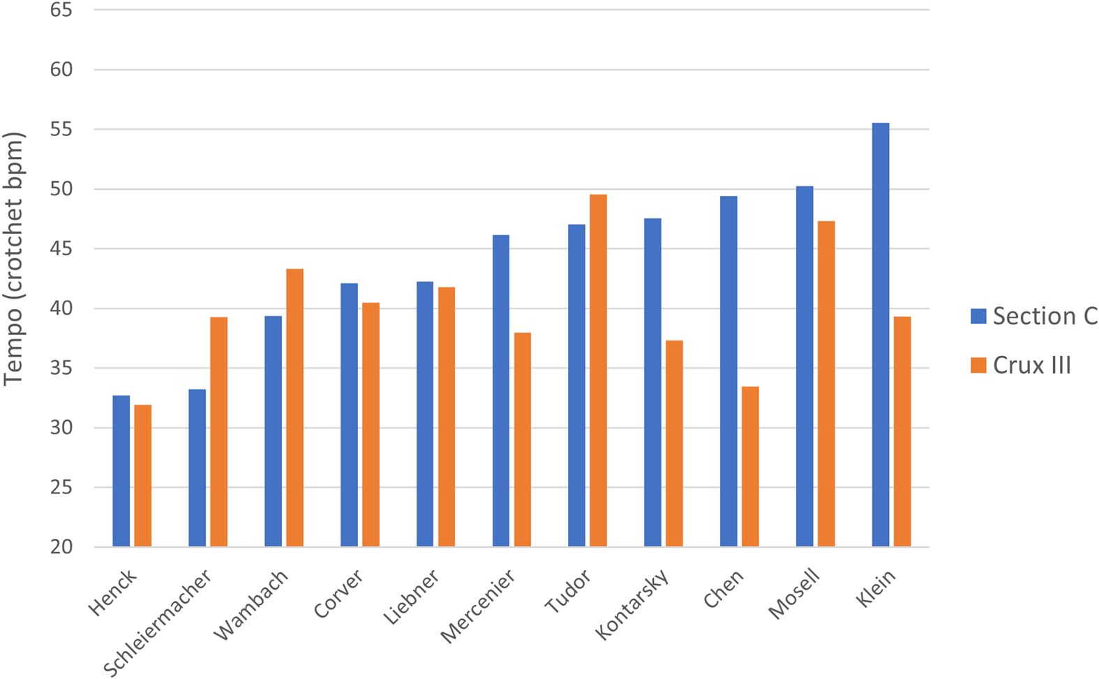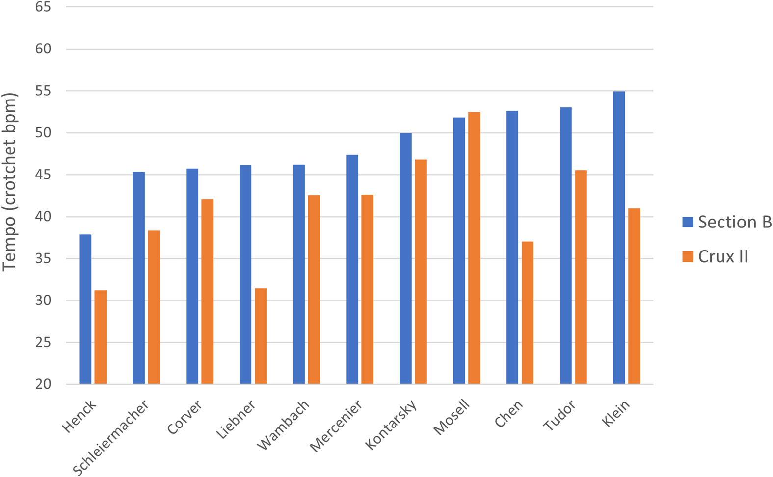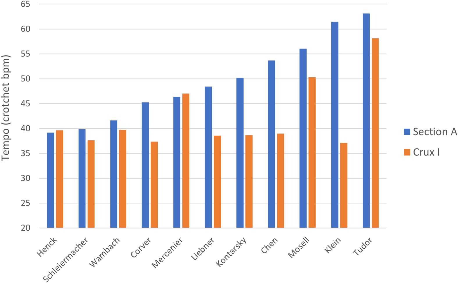 While certain stylistic correspondences can be heard between performances at similar tempi, there are also notable differences, particularly affected by tempo consistency and the proportional performance of Cruxes. As Figures 3–7 illustrate, with performers in ascending order of sectional tempi, these passages are almost always performed more slowly than their respective Sections. Isolated exceptions to this rule include Henck and Mercenier for Crux I, Mosell for Crux II, Schleiermacher, Wambach and Tudor for Crux III, Mosell and Tudor for Crux V and Wambach for Crux VI. In contrast, six of the eleven pianists play the demisemiquaver-quintuplets of Crux IV faster than their average tempo for Section D, highlighting a tendency for pianists to perform this Crux with greater virtuosity, perhaps in response to the more idiomatic grouping of pitches.