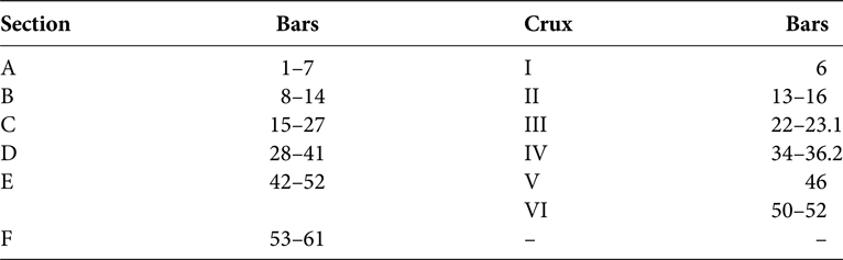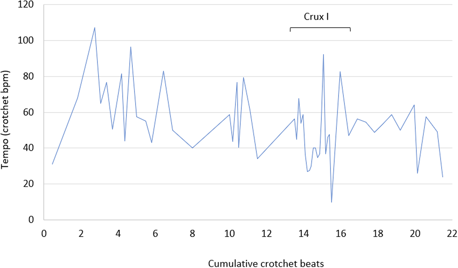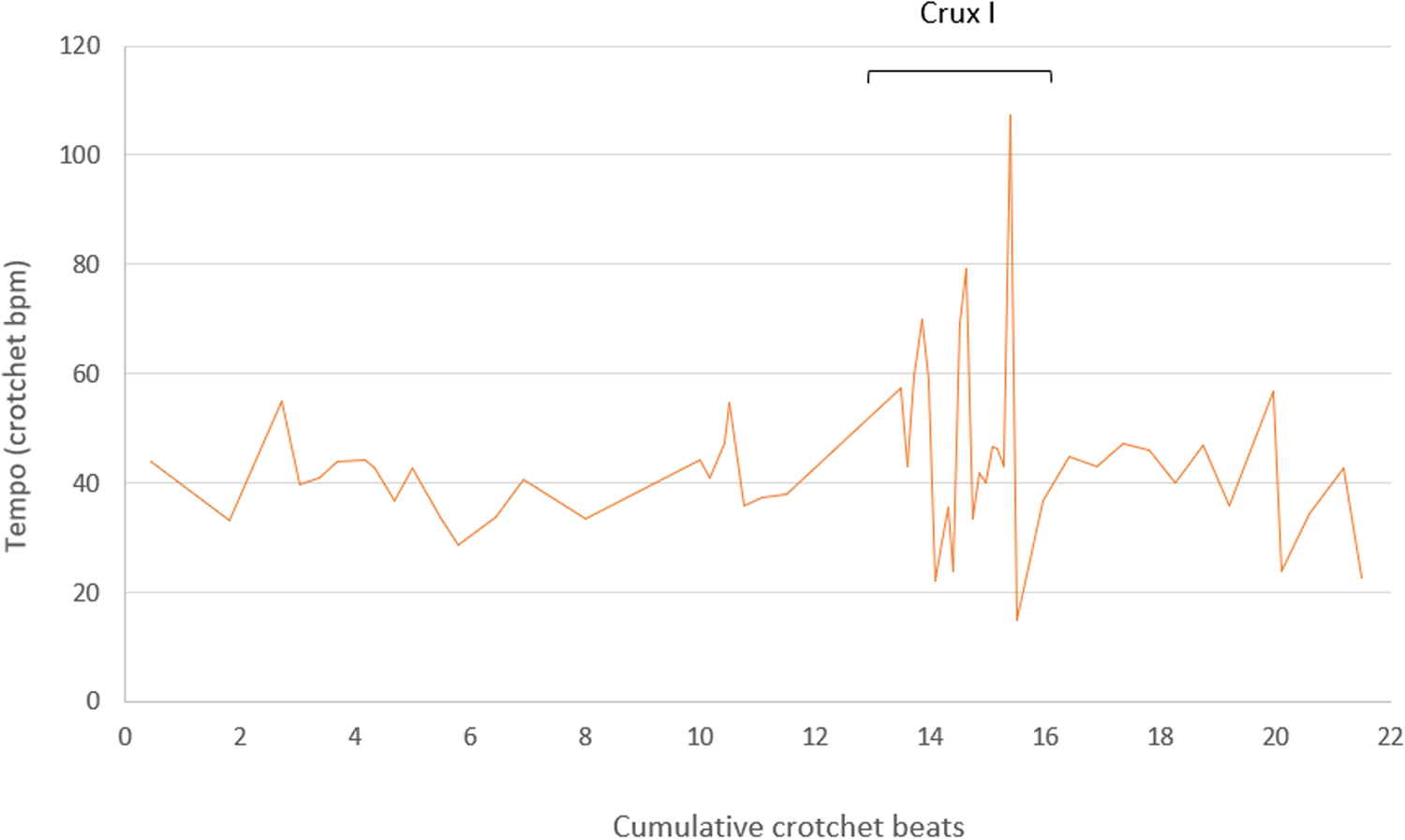 Finally, some notes on my technical approach. In Table 2 and throughout my analysis, individual attacks, containing single or multiple tones, are referenced in terms of their position within each bar; for example, attack 1.8 for the G–F♯ dyad in bar 1. Inter-onset timings were extracted using Sonic Visualiser. In light of their temporal ambiguity, grace-notes, appearing individually or in pairs in bars 7, 19, 20, 34, 42, and 54 were not accounted for, resulting in an inevitable, if slight distortion of timing data. Misalignments and omissions were necessarily factored into calculations. Since they are not consistently audible, the release of notes/onset of rests was disregarded. Consequently, average tempo was determined from the first attack value of sections beginning with rests and average tempo for preceding sections was determined up until the final attack value. Average tempi for Cruxes I and IV were determined up until the final attack of each bar, thereby avoiding the metric ambiguity of subsequent grace-notes. ‘Global tempo’ refers to the average tempo of the performance as a whole.