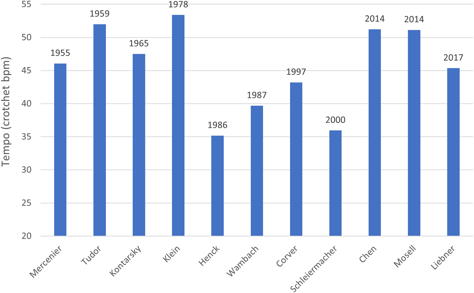 Individual responses to Stockhausen's ‘as fast as possible’ direction have resulted in a wide range of global tempi in the selected corpus of recordings, presented in ascending order in Figure 1. While limited, these data suggest the presence of relatively slow (Henck, Schleiermacher, and Wambach), moderate (Corver, Liebner, Mercenier, and Kontarsky) and fast (Mosell, Chen, Tudor, and Klein) performance types. As the chronological ordering of Figure 2 illustrates, Henck's recording is significantly slower than those of his predecessors, ushering in a series of slower performances before a return to faster tempi in the 2010s. Together the data suggest personalized responses to the ambiguous affordances of the score.