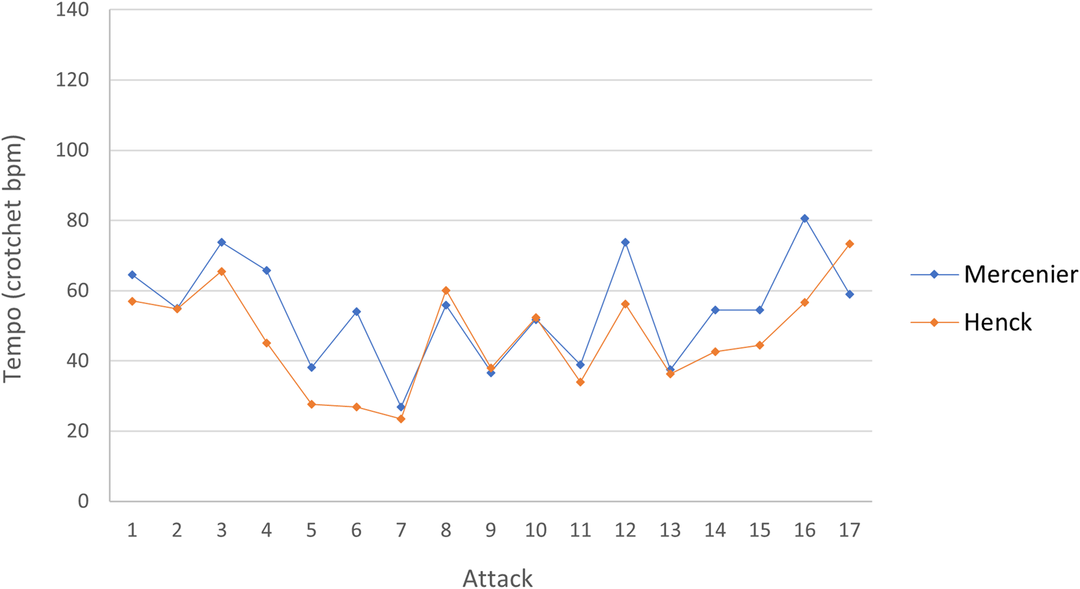 Figure 8 (Colour online) Mercenier and Henck Crux I tempo comparison.