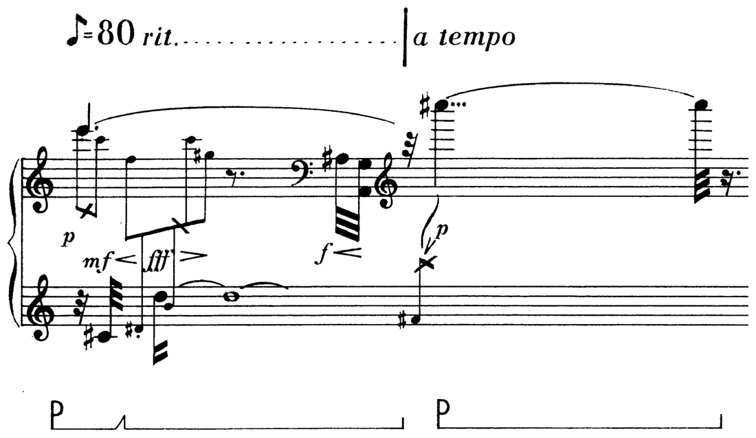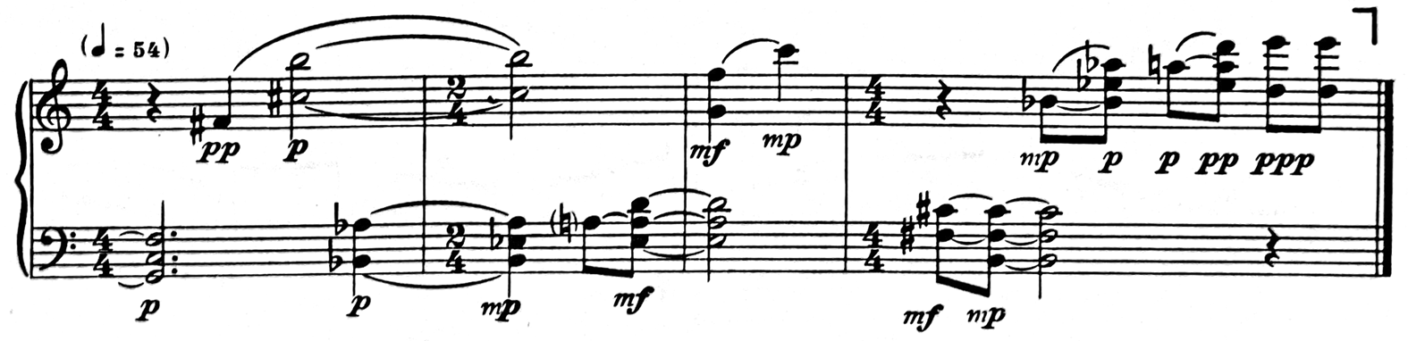 Example 6 Karel Goeyvaerts, Sonata for 2 Pianos, Op. 1, bb. 4–6. Used by permission of Donemus Publishing.