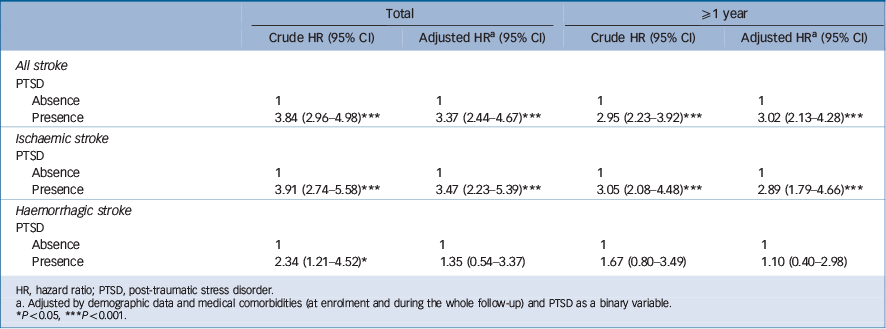No previous study had investigated the relationship between PTSD and subsequent haemorrhagic stroke, and the risk of such stroke among patients with PTSD was still unknown. In our study, the crude hazard ratio of haemorrhagic stroke among patients with PTSD was statistically significant, but this significance disappeared after adjusting for medical comorbidities. It may indicate that the association between PTSD and haemorrhagic stroke was indirectly due to other medical comorbidities, such as hypertension and head injury. However, further studies would be required to elucidate this possible association between PTSD and haemorrhagic stroke.
