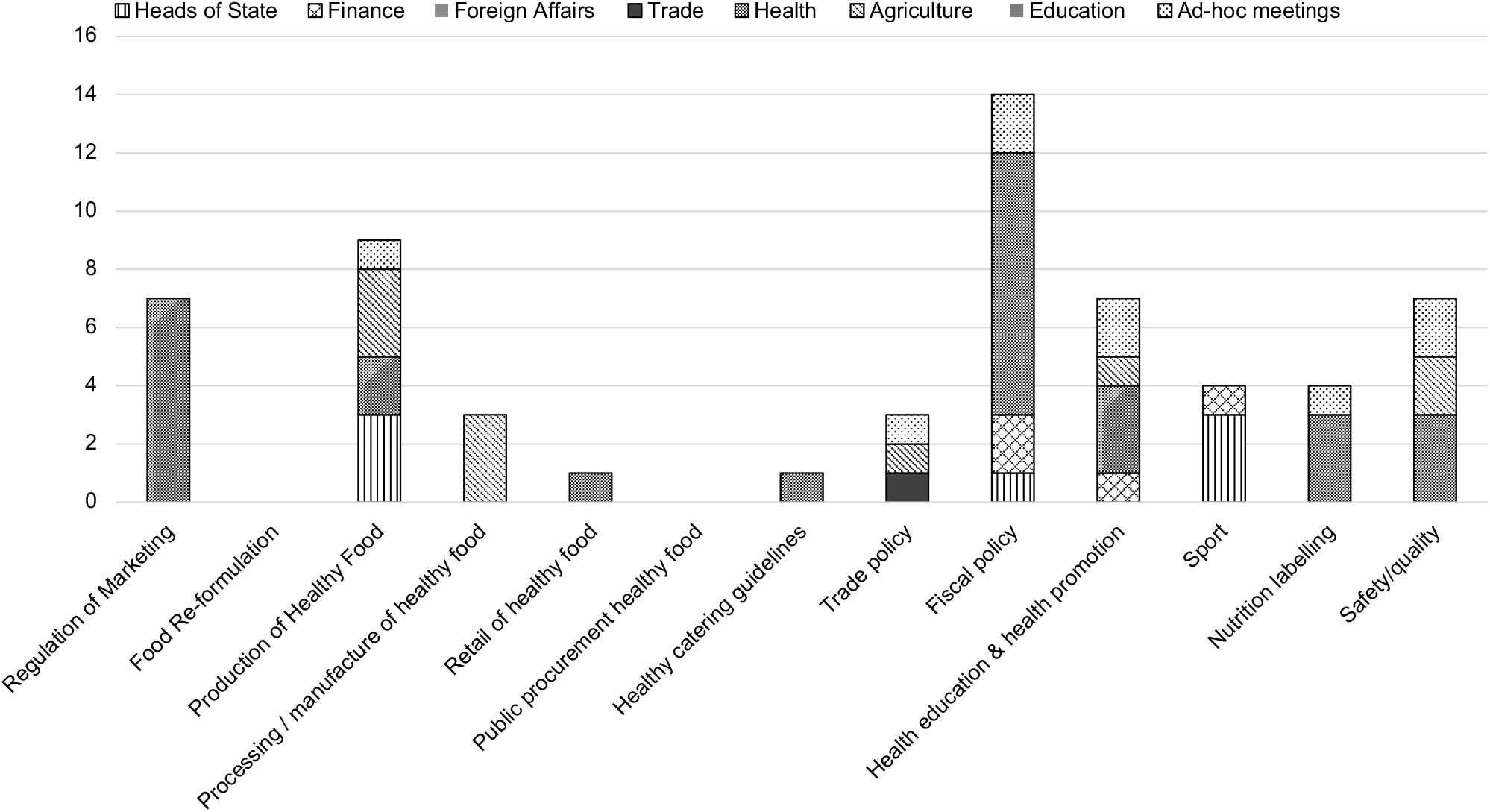 We used the WHO’s NCD Global Action Plan( 9 ) to determine sectors most relevant to food and nutrition policy, and then searched electronically to identify which of these sectors held significant meetings involving ministers or heads of sector (i.e. the chief civil servant) in the Pacific. We focused on high-level meetings where participants have a mandate to make or implement policy. In addition to Leaders (Heads of State) meetings, we identified: finance and economy; agriculture; health; trade; education; trade and foreign affairs as relevant sectors which also convened regular, high-level meetings.