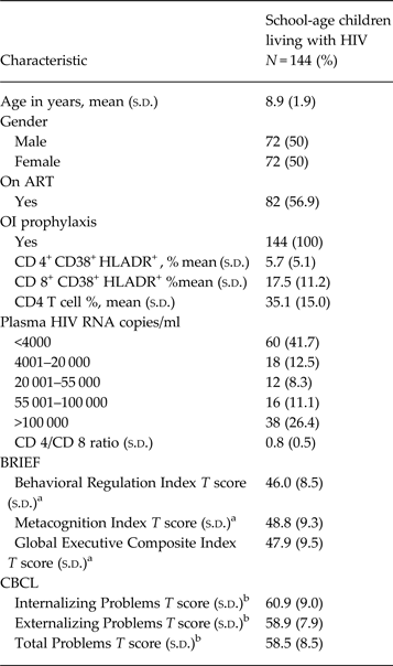 Several tools have been used to measure behavioral problems in children living with HIV (Black et al. Reference Black, Baqui, Zaman, McNary, Le, Arifeen and Black2007) some of them tested and validated for their use in sub-Saharan Africa (Bomba et al. Reference Bomba, Nacinovich, Oggiano, Cassani, Baushi, Bertulli and Badolato2010; Tadesse et al. Reference Tadesse, Berhane Tsehay, Girma Belaineh and Alemu2012; Boivin et al. Reference Boivin, Bangirana, Nakasujja, Page, Shohet, Givon and Klein2013). The Behavior Rating Inventory of Executive Function (BRIEF) (Gioia et al. Reference Gioia, Isquith, Guy and Kenworthy2000) and the Achenbach Child Behavior Checklist (CBCL) (Achenbach, Reference Achenbach1991) are among the most widely used measures to assess behavioral, emotional, social and functional problems in school aged children. The BRIEF was designed to screen for emotional and behavioral aspects of a child's executive functioning as assessed from the perspective of the principal caregiver or parent. In contrast, the CBCL was designed to more broadly screen for emotional and behavioral psychiatric symptoms in children.