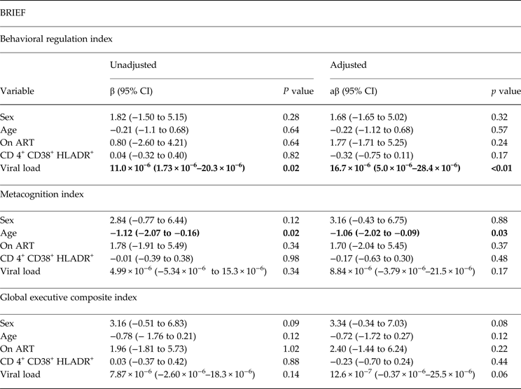 Results from linear regression analyses are presented in Tables 2 and 3. Regression models for BRIEF were adjusted for gender, age, ART status, CD4 T-cell activation and viral load. Higher behavioral regulation index scores on the BRIEF were associated with higher viral loads (aβ = 16.7 × 10−6, 95% CI −5.00 × 10−6 to 28.4 × 10−6) (Table 2). Children who were older had lower Metacognition Index (MI) scores (e.g. less capacity to plan, working memory and organize) when compared with younger ones (aβ = −1.06, 95%CI −2.02 to −0.09) (Table 2).